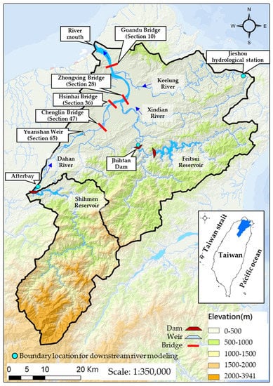 The watershed of the Tamsui River basin with the specific structure locations.
