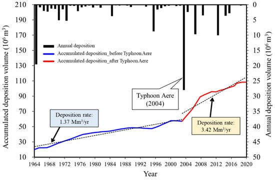 In the typhoon Aere event, the flood peak discharge in Shihmen Reservoir was estimated to be about a 100-year return period flood. As a catastrophic disaster flood event, it carried a massive amount of sediment and deposited 27.88 Mm3, nearly 9% of its original storage capacity, which caused the water supply system to shut down for 18 days. Among 100 check dams, 38 check dams were damaged, and 74 were filled with sediments after Typhoon Aere [41]. Before Typhoon Aere, the accumulative deposition volume presents a mild increment with a yearly average deposition rate of 1.37 Mm3/yr. The yearly average deposition rate is defined as the average sediment depositional volume per year. However, in the absence of effective sediment management strategies, the average deposition rate shows a steeper tendency of 3.42 Mm3/yr after Typhoon Aere.