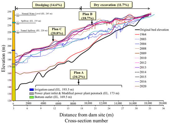 Projections of storage capacity and cumulated sediment deposition volume at Shihmen Reservoir for the next five decades under various desilting strategies are analyzed and plotted in Figure 8. It is considered that mechanical removal by dredging and dry excavation is regularly applied for the next fifty years. Besides mechanical removal, Plan A, B, and C projects by hydraulic desilting measures are adopted for sustainable water usage. Since 2013, when project Plan A was implemented by installing the modified power plant penstock, the total desilting efficiency based on field-measured data presents an average value of about 32.26% listed in Table 1, higher than that of those without the modified power plant penstock. As mentioned in Section 2.2, the expected desilting efficiency of 34.2% is designed in Plan A with the modified power plant penstock, which is close to the value (32.26%) taken from the measured data. Plans B and C propose to construct the facilities for sediment bypassing, including the Amuping desilting tunnel and the Dawanping desilting tunnel, which will be completed in 2022 and 2030, respectively. According to data obtained from the Water Resources Planning Institute and Northern Region Water Resources Office [42,43,44], the desilting efficiency for Plans B and C is estimated to be 18.7% and 20.8%, respectively.