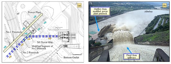 Desilting operations by sediment sluicing: (a) layout of the power plant penstock No. 1 and the modified power plant penstock No. 2; (b) outflow with high sediment concentration sluiced through modified penstock No. 2 and flood releasing from spillways during the first operation in 2013 Typhoon Soulik.