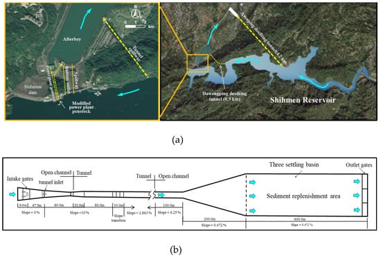 Outlet facilities in Shihmen Reservoir: (a) layout of outlet structures and desilting tunnels; (b) plan view of the Amuping desilting tunnel with the settling basin.