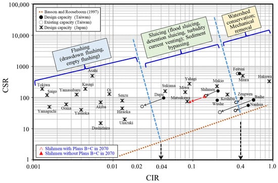 Two indexes, CIR and CSR, were proposed by Basson and Rooseboom (1997), which were further implemented to evaluate desilting techniques based on hydrological data and storage capacity in many reservoirs [26]. The capacity–inflow ratio (CIR) is defined as the reservoir capacity (CAP) divided by the mean annual runoff (MAR), and the capacity–sediment ratio (CSR) is defined as the CAP divided by the mean annual sediment (MAS). Based on CIR and CSR values, desilting techniques applied to the major reservoirs in Japan and Taiwan are presented in Figure 6. Accordingly, reservoir life may be indicated by the CSR value, and the CIR value may indicate the residence time of water [30].