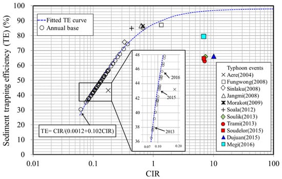 The sediment trapping efficiency (TE) is used to calculate the actual deposition volume and remaining storage capacity, which is a valuable and straightforward parameter for evaluating the life expectancy of a reservoir. The sediment trapping efficiency is expressed as the ratio of annual sediment deposition volume to incoming annual sediment volume. Analyzing the measured data of 44 reservoirs in the U.S., Brune (1953) [50] developed an empirical curve that has been the most widely adopted method for assessing reservoir trapping efficiency [51,52]. The sediment trapping efficiency presents a trend relationship with the CIR index based on the curve approach, which can be fitted by a curve equation as plotted in Figure 7. Using the data collected from Shihmen Reservoir, the sediment trapping efficiency agrees with the tendency of the Brune curve under an annual temporal scale. However, the trapping efficiency may differ significantly from the Brune curve for one flood event with a desilting operation. As a result, the sediment trapping efficiency varies between an annual temporal scale and a single typhoon flood event. When multiple flood events occur in a year, the sediment trapping efficiency follows the Brune curve trend, as seen in 2013, 2015, and 2016 (see Figure 7). Moreover, different hydrological conditions may occur in sediment desilting operations during flood events. The trapping efficiency corresponding to one flood event may not fall close to the Brune curve. Therefore, the annually based calculation is suggested to estimate the annual sediment trapping efficiency for planning desilting strategies. The annual sediment deposition volume in a reservoir can be estimated by using the Brune curve approach. Since some reservoirs may have a dredging or excavation plan in execution, one needs to calculate the actual deposition volume to avoid underestimating inflow sediment.