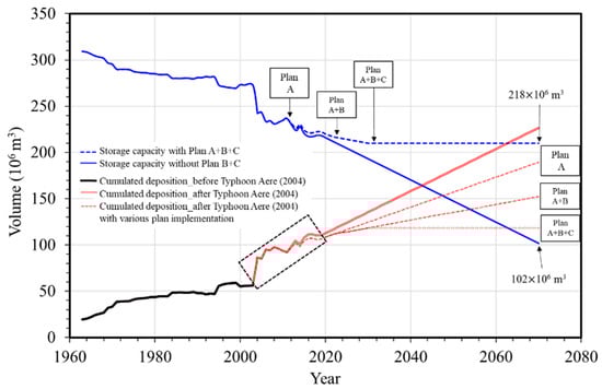 Based on the average deposition rate of 3.42 Mm3/yr after Typhoon Aere (see Figure 2), the trend line of cumulative sediment deposition volume in the next fifty years is illustrated in Figure 8. It indicates that without effective sediment management strategies, the projected storage capacity applied may drop to 102 Mm3 (about 32.9% of the initial storage capacity) in 2070. When Plan B is implemented to join the desilting operation in 2022, the trend line of cumulative sediment deposition volume in the next fifty years presents a mild slope in Figure 8. Similarly, when Plan C is completed in 2030, it presents a flat trend line corresponding to the storage capacity changes. Therefore, if the integrated sediment management strategies can be implemented by following the planned schedule mentioned above, the sustainable management of water resources may be achieved to preserve 218 Mm3 of the reservoir storage capacity in 2070, which is about 70.3% of the initial storage capacity.