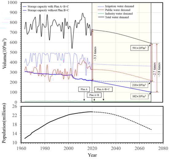 Shihmen Reservoir provides storage space as a natural resource for irrigation and water supply. The historical data of various demands per year from irrigation, public water supply, and industrial water since Shihmen Reservoir was built are plotted in Figure 9. In 2020, as seen in Figure 9, the total water demand is approximate 3.3 times the reservoir storage capacity, i.e., the annual turnover rate of water demand is 3.3. Herein, the annual turnover rate of water demand is defined as the ratio of the annual total water demand volume to the existing reservoir storage capacity. Based on the latest statistical data of the population projection by the National Development Council, Taiwan, and the projected water resource usage by WRA, Taiwan, the water resources demand will diminish in the next fifty years, corresponding to population decrease.