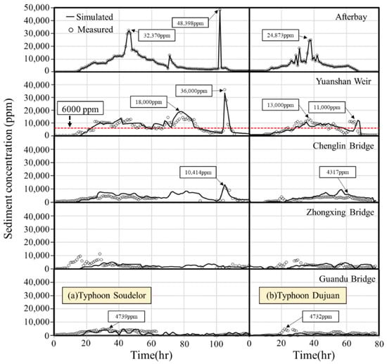 Figure 10 illustrates hydrographs of the measured and simulated sediment concentration against time in the Typhoon Soudelor and Typhoon Dujuan events which involved 130 and 90 h durations of flooding, respectively. In Typhoon Soudelor, the measured data at Yuanshan Wier reveal that the peak sediment concentration reaches around 36,000 mg/L at the third time desilting operation, and sediment concentration is much higher than 6000 mg/L most of the time (see Figure 10a). During sluicing operations, sediments were released through the spillways, the tunnel spillways, the bottom outlet, and the modified power plant penstock during the flood events. In addition, the outflowing sediments were sampled and classified as silt and clay, which could affect the water quality of the intake at Yuanshan Weir due to exceeding the raw water turbidity limitation of 6000 mg/L. The simulated results in both flood cases indicate that fine sediments could be transported far downstream to the Chenglin Bridge within the tidal river reach and the Guandu Bridge near the river mouth, as shown in Figure 10a,b. In addition, based on the grain size, such fine sediment released from Shihmen Reservoir may affect the deposition mechanism in the tidal river reach. However, when the released turbid water flows into the tidal-affected area, the sediment concentration can be lower than 6000 mg/L due to flow mixing with the floodwater from the tributaries of the Xindian River and Keelung River. The sediment concentration varied throughout the downstream river during these two flood events. Although sediment concentration released from outlets during the desilting operations could be relatively high, it decays gradually along the downstream river. Furthermore, the simulated sediment concentration variations against time agree well with the measured data, demonstrating good performance of the model.