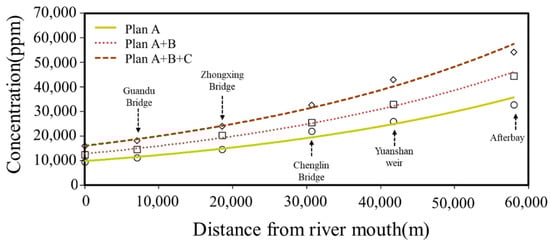 After model validation, the hydrological conditions of Typhoon Aere in 2004 are utilized to investigate and discuss the changes in the trend of sediment concentration along the downstream river of Shihmen Reservoir before and after the completion of the power plant penstock modification (Plan A), the Amuping desilting tunnel (Plan B), and the Dawanping desilting tunnel (Plan C). Since the construction of the dam, Typhoon Aere caused the most severe sedimentation problem in Shihmen Reservoir. Following various scenarios, the simulation analysis of peak sediment concentration at different locations along the river is plotted in Figure 11. After completing the Amuping desilting tunnel and the Dawanping desilting tunnel, the simulated results for concentration released at Afterbay indicate that the sediment concentration of Plans A + B + C increases about 1.6 times that of Plan A. The simulated sediment concentration in the estuary is about 30% of that at Afterbay in the scenario of Plans A + B + C. The spatial variation of sediment concentration along the downstream river presents an exponential trend line from Afterbay to the river mouth. Herein, the simulated results from hydromorphological modeling are reasonable to investigate long-term impacts on the downstream river resulting from reservoir desilting operation.