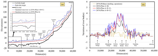 Given the same hydrological conditions of past typhoon events in Table 1, Figure 12a shows the simulated results of long-term floodwater levels. The results show that the floodwater stage in 2070 does not overflow either of the riverbanks from Afterbay to the river mouth, except the river reaches upstream of Yuanshan Weir, and the river reaches around Guandu Bridge. However, if the floodwater stage exceeds the warning water level, evacuation actions need to initiate inundation disaster emergency response. Based on the riverbed elevation in 2020 as a datum, Figure 12b shows simulated riverbed elevation changing along the river thalweg in 2030, 2050, and 2070. The reach from Afterbay to Yuanshan Weir is an exposed rock bed with a steep slope, so sediment deposition is much less than that of the river reach with a gentle bed slope, typically at the reach between Sanxia River and Zhongxing Bridge. However, due to the tidal effect and mild bed slope, more significant deposition is observed in the simulation scenarios with desilting operations of Plans A + B + C. As seen in Figure 12b, between Hsinhai Bridge and Chenglin Bridge, the increment of sediment deposition estimated in the next 10 years is about 1.45 m, in the next 20 years is about 2.26 m, and in the next 50 years is about 2.73 m.