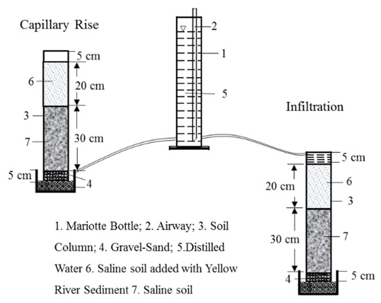 Plexiglass tubes with uniform perforation at the bottom (aperture 1.5 mm) were prepared for the experiment, and the tubes were 14 cm in inner diameter and 60 cm in height with a thickness of 0.5 cm. A gravel-sand (2–3 mm in diameter) layer was placed at the bottom of the column, and filter paper was placed between the saline–sodic soil and the gravel-sand filter layer to prevent mixing. The gravel-sand was cleaned with diluted hydrochloric acid and distilled water before the experiment. The saline–sodic soil was filled in layers (5 cm at a time) to a height of 50 cm, and there was a 5 cm space reserved at the top of the plexiglass column (Figure 1). The soils and sediments were air-dried, crushed and passed through a 2 mm sieve before being statically compacted. The water head height is maintained at 5 cm for one-dimensional pounding infiltration, controlled by Mariotte bottle. The gravel-sand was immersed in the beaker to simulate the capillary rise of groundwater under natural conditions. The outlet of the Mariotte flask was consistent with the gravel-sand surface.
