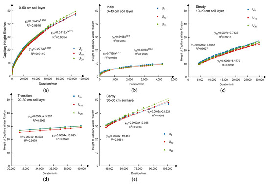 It showed that the height of capillary water rise increased with time in the 0–50 cm layer, and there was no significant difference among U0, U10 and U20 at the same time (Figure 2). In the 0–10 cm soil layer, the capillary water rise height over time followed the power relationship with the determination coefficients higher than 0.99 for U0, U10 and U20 (Figure 2b). In the 10–20 cm and 20–30 cm soil layers, the capillary rise height of U0, U10 and U20 showed a linear relationship with time, and the capillary water rise height of U0 was higher than that of U10 and U20 at the same time. For the 30–50 cm soil layer, the capillary water rise height varied with time and showed a linear relationship. The actual capillary water rise height is higher than the simulated height (Figure 2e), which can be attributed to the comprehensive impact of the soil particle composition structure and soil water gravity on the soil layer with the added sediment [33].