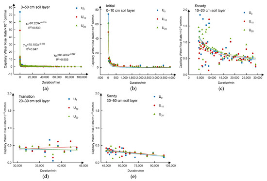 Variation of capillary rise rate with time (a), initial (b), steady (c), transition (d, and sandy (e) period. U0, U10 and U20 indicate the upward water treatments of the sediment addition with 0 kg/m2,10 kg/m2, and 20 kg/m2, respectively.