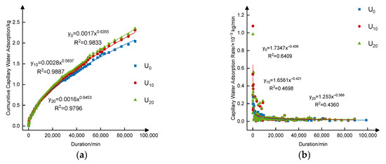 Similar to the variation of the capillary rise height with time, the cumulative capillary soil water adsorption with time also presents power relationship for U0, U10 and U20 (Figure 4a). Compared with U0, the cumulative capillary soil water adsorption of U10 and U20 increased by 9.06% and 3.80% for the initial period, increased by 8.91% and 6.65% for the steady period, increased by 16.88% and 23.88% for the transition period and increased by 17.48% and 25.62% for the sandy period (Table 3). The results showed that the mixed sediment layer not only increased the adsorption capacity of the mixed layer to soil water but also had a positive impact on its adjacent layers, and similar results can also be seen in Song et al.’s investigation [35].