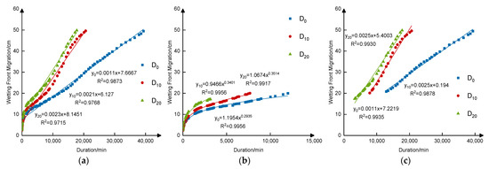 In the 0–50 cm soil layer, the wetting front migration is positively correlated with time. The determination coefficients (R2) of D0, D10 and D20 are greater than 0.97, and the slopes of D10 and D20 are greater than that of D0, which indicates that the infiltration rate of D10 and D20 is high (Figure 6a). This can be attributed to the ratio of the macroporosity increase with the addition of sediment. However, in the 0–20 cm soil layer, the infiltration wetting front showed an exponential relationship with time, and the determination coefficients were all above 0.99 for D0, D10 and D20 (Figure 6b). Furthermore, a positive correlation was shown in the 20–50 cm layer with the determination coefficients of 0.993, 0.9878 and 0.9935 for D0, D10 and D20, respectively (Figure 6c). The simulation of piecewise functions is better than full-time simulation, which is similar to Mathur et al. [21] and Gan et al. [36]. The difference of the fitting curve among the D0, D10 and D20 treatments at different soil layers can mainly be attributed to the air resistance as poor ventilation inside the soil [30].