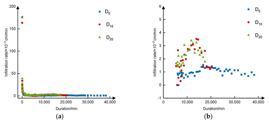 In the 0–20 cm layer, the infiltration rates of D0, D10 and D20 were rapidly reduced from 176.67 × 10−3 cm/min, 163.3 × 10−3 cm/min and 175.0 × 10−3 cm/min at the beginning to 0.963 × 10−3 cm/min, 1.111 × 10−3 cm/min and 1.974 × 10−3 cm/min at the end, which were reduced by 183.46, 147.01 and 88.65 times, respectively (Figure 7a). The average infiltration rates of the 0–20 cm layer for D0, D10 and D20 were 7.834 × 10−3 cm/min, 8.733 × 10−3 cm/min and 13.254 × 10−3 cm/min, respectively. The infiltration rate of the three treatments initially increased and then decreased with time in the 20–50 cm layer (Figure 7b), and D10 and D20 both reached a maximum infiltration rate at 13,887 min (corresponding to infiltration depths of 37.5 cm and 42.5 cm, respectively), while D0 reached a maximum infiltration rate at 20,000 min (corresponding to an infiltration depth of 25.6 cm). During the water infiltration progress, the average infiltration rate of D0 was significantly lower than those of D10 and D20 in the 20–50 cm layer (which were 1.10 × 10−3 cm/min, 2.16 × 10−3 cm/min and 2.19 × 10−3 cm/min for D0, D10 and D20, respectively). In the 0–50 cm layer, the average infiltration rates for D0, D10 and D20 were 4.936 × 10−3 cm/min, 6.560 × 10−3 cm/min and 8.315 × 10−3 cm/min, respectively.