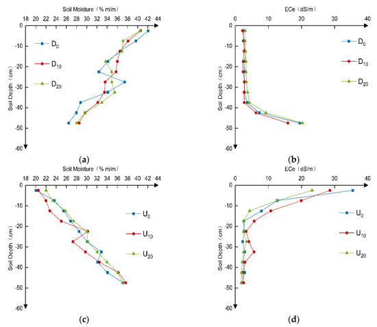 Distribution of soil moisture (a, c) and saturated extract electrical conductivity (ECe) (b, d) for downward/upward water treatments. D0, D10 and D20 indicate the sediment addition treatments with 0 kg/m2,10 kg/m2 and 20 kg/m2, respectively, for downward water; U0, U10 and U20 indicate the sediment addition treatments with 0 kg/m2,10 kg/m2 and 20 kg/m2, respectively, for upward water.