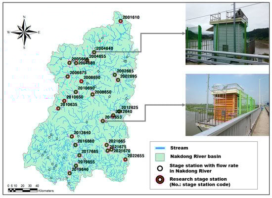 Sensitivity analysis and determining the appropriate range of filter parameters for baseflow separation methods require a long-term continuous streamflow record in a river. The four baseflow separation methods were applied to stage stations of Nakdong River in the Republic of Korea. There are 60 stage stations in Nakdong River, and we selected 25 of them to analyze the baseflow separation methods. The criterion for selecting the research stage stations was no missing values for more than 8 years among the last 20 years of the historical data.