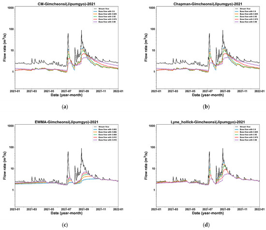Measured streamflow and the separation outcomes of the four baseflow separation methods by the filter parameters from the Gimcheonsi (Gimcheonsi) in 2021: (a) CM; (b) Chapman; (c) EWMA; (d) Lyne–Hollick.