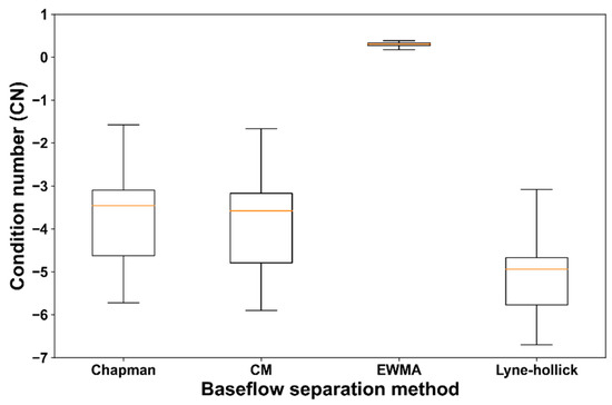 Table 6 shows condition numbers of the BFI for the study stations calculated from the baseflow separation methods. The LH method is the most sensitive to changes in the filter parameter among the four methods. The EWMA method is the most insensitive method. Figure 7 is a box–whisker plot of Table 6. It can be seen that the EWMA method has the smallest deviation in the condition numbers according to the station. Based on this result, it may be decided that the EWMA method is a convenient method to use among the baseflow separation methods.