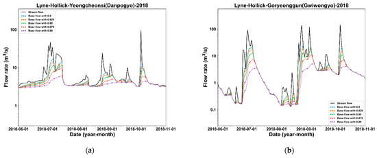 Table 7 shows the determined filter parameters for each baseflow separation method at the study stations. We determined the appropriate filter parameters based on two criteria: the appropriateness of separated baseflow during dry seasons and the reasonability of the baseflow increase in wet seasons. The two criteria and determined filter parameters for reference include subjective judgment. First of all, the Chapman and CM methods failed to separate the appropriate baseflow for most stations and all filter parameters. In particular, the methods had more problems separating the baseflow during the dry seasons than in the wet seasons. On the other hand, the LH and EWMA methods were able to achieve reliable baseflow separation results through the selection of appropriate filter parameters (Figure 8 and Figure 9). However, since the results of the methods had different appropriate filter parameters for each station, the parameters were presented as an appropriate range rather than defined as a single value.