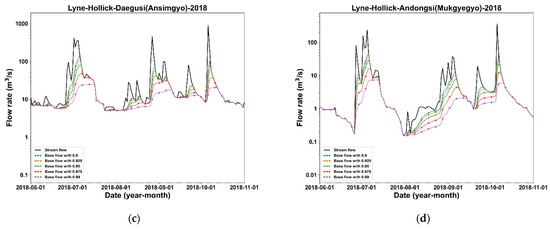 Measured streamflow and the separation outcomes of the Lyne–Hollick method by the filter parameters in 2018: (a) Yeongcheonsi (Danpogyo); (b) Goryeongun (Gwiwongyo); (c) Daegusi (Ansimgyo); (d) Andongsi (Mukgyegyo).