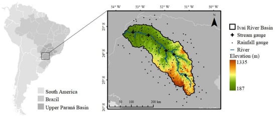 The Ivaí River Basin (IRB) is in southern Brazil and covers an area of 36,589 km² (Figure 1), with a 680 km length. The source is 800 m above sea level. The river flows inland in a northwest direction, assumes a western orientation, and empties into the Paraná River, featuring one of the major tributaries of its left margin [18]. The elevation measurement ranges from 187 to 1335 m. Ivaí basin also belongs to the Itaipu Incremental Basin that regulates Itaipu Dam, the second-largest hydropower plant in the world in terms of installed capacity.