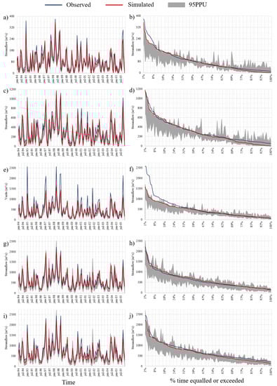 In order to understand the discrepancies between simulated and observed flow regimes, each station was treated individually, aiming to identify particularities of the basins’ drainages and the performance of the model. The 95PPU intervals from calibration are shown in Figure 2. To present the uncertainty within the FDC, the interval was constructed respecting the uncertainty of each simulated monthly flow. Each station was discussed in the following sections, and results are summarized in the Supplementary Material, Table S3.