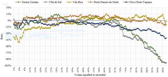 Some percentages of exceedance piqued greater interest during the hydrological analysis. For example, the flow rate of 50% of exceedance of time corresponded to the median flow, identified by Q50. The values of Q10 and Q90 represented the flow rate, which was exceeded by 10% and 90% of the time, respectively. Q90 is often used as a low flow rate [50]. The Q90/Q50 ratio was applied as a baseline contribution indicator [51], whereas Q10/Q50 indicated flood peaks [52]. Q10/Q90 was employed as an indicator of flow variability [53] and Q95 was used to define the operability of firm power generation from hydroelectric plants [54], in addition to being the minimum flow to protect the river [55].