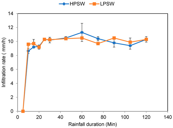 Figure 2 presents the observed infiltration rates for the permeable clay brick. The outflow water was measured at 5 min intervals for the first 30 min and 15 min intervals for the remaining 90 min. The infiltration rate increased sharply for a short period until 10 min; later, it became steady and approached the saturated hydraulic conductivity. No outflow was observed until 5 min of rainfall. After 10 min, the average steady-state infiltration rate of 9.8 ± 0.52 mm/h was measured for HPSW and 10.0 ± 0.46 mm/h for LPSW. These results are consistent with a previous study that reported 10 min for reaching a steady-state condition for the ceramic permeable brick layer [25].