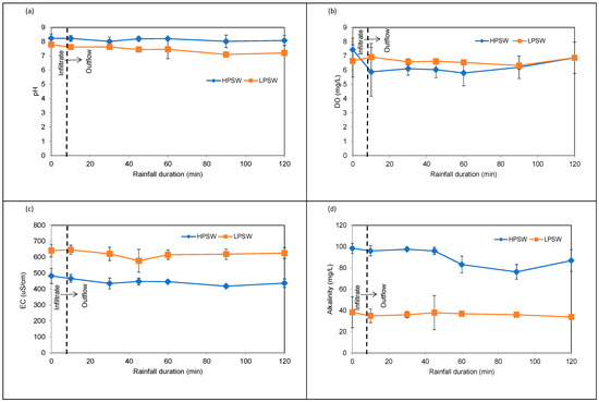 The variation of pH, DO, alkalinity, and EC of two SW samples at different rainfall durations is presented in Figure 3. No significant change of pH was observed for HPSW and LPSW that ranged from 7.0 to 8.0. Dissolved oxygen (DO) also remained almost unchanged and was kept between 5.6–7.0 mg/L for the HPSW and LPSW. Alkalinity and EC also almost remained unchanged throughout the infiltration time. The results indicated that stormwater infiltration through clay bricks did not affect the physical water quality and did not meet the standard guideline for reuse applications [33,34,35,36].