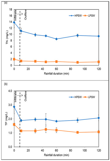 Figure 6 presents the TP variations at different rainfall durations. The average TP removal was achieved at 34.7% for HPSW and 31.3% for LPSW. The influent TP concentrations of 2.8 and 1.6 mg/L were reduced to 1.8 and 1.1 mg/L, respectively, at the outlet for HPSW and LPSW. The phosphorus removal by clay bricks can be attributed to the chemical adsorption of phosphate anions onto the clay-based filter or physical interception of precipitated phosphorous in the pore structure of the clay bricks [25].