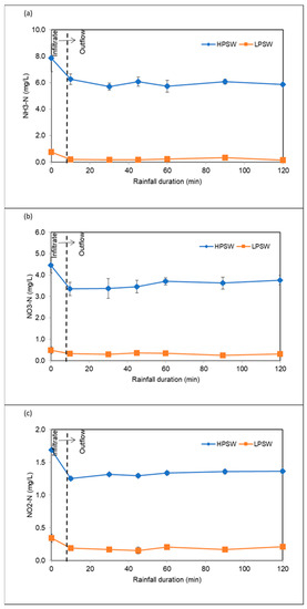 Removal of TN and TP during infiltration is presented in Figure 6. Analysis of the nitrogen compounds showed that HPSW and LPSW were mainly composed of NH3–N (38.0–56.8%) and NO3–N (25.0–32.2%) (calculated from Table 3), which is consistent with the previous study [18]. The TN concentrations in HPSW and LPSW were reduced to 9.9 and 1.19 mg/L from the influent concentrations of 13.8 and 1.96 mg/L. The corresponding average removals were 30.5% for HPSW and 39.1% for LPSW after 120 min of rainfall, indicating a moderate TN removal by the clay brick layer. Mostly, TN removal from water relies on the adsorption matrix and microbial nitrification and denitrification process [38]. In this study, TN removal via the clay brick layer primarily occurred from the adsorption of NH3–N and NO3–N onto the clay bricks. The nitrification and denitrification processes were absent due to the limited microbial effect during the short infiltration period (2 h). Figure 7 presents the variations of NH3–N, NO3–N, and NO2–N during the infiltration through the brick layer. The results showed that a significant amount of NH3–N (22.7% and 69.2%) and NO3–N (13.2% and 35.2%) were reduced from HPSW and LPSW. The removal of NO3–N by the clay bricks can be attributed to possible adsorption onto the clay bricks. Moreover, the clay bricks contain a high amount of monovalent cation Na+ and K+ ions and can be readily available for cations exchange reaction with NH3–N, which may lead to NH3–N removal [39]. TN removal efficiency of the clay brick layer showing a similar pattern for HPSW and LPSW indicates the effectiveness of the designed permeable pavement for a diverse range of polluted stormwater.