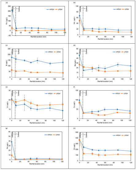 Figure 8 illustrates the variation of heavy metal concentrations in the clay bricks experiments. It was observed that the performance of the clay bricks was moderate to high for heavy metals removal from stormwater. The removal showed a similar pattern for both HPSW and LPSW achieving, respectively, 88.5% and 94.3% removal for Fe, 70.2% and 76.5% for Mn, 23.2% and 24.1% for B, 49.5% and 38.3% for Ba, 33.2% and 6.7% for Cr, 54.5% and 68.9% for Cu, 94.5% and 94.2% for Pb, and 48.7% and 69.7% for Zn (Figure 9). Removal of all heavy metals remained consistent over the rainfall duration. pH is the most critical parameter for the oxidation and precipitation of heavy metals during the infiltration process. In this study, both HPSW and LPSW had average pH values of 8.24 and 7.79, which slightly changed to 8.0 and 7.33 after infiltration through the clay bricks. Most of the metals can form precipitates in this range of pH [40] and can be removed by the micro-porous clay bricks. Some of the heavy metals including Cu and Zn can also be removed through the nonspecific electrostatic adsorption process on the clay-based bricks [41]. Heavy metals removal by the clay bricks is comparable with other LID technologies (Table 4), which indicates the suitability of the clay bricks for use as an alternative option to remove pollutants from SWs.