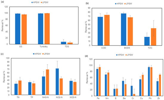 Removal efficiencies of (a) SS, turbidity and TDS, (b) organics, (c) nutrients, and (d) heavy metals from HPSW and LPSW after infiltration through permeable clay bricks.