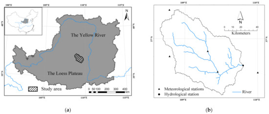 Location of the study area: (a) location of Yanhe River Basin on the Loess Plateau, (b) distribution of hydrological and weather stations.