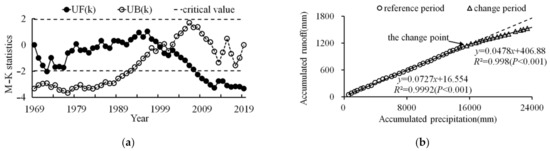 Analysis of runoff abrupt change: (a) MK mutation test, (b) double mass curves of precipitation-runoff.