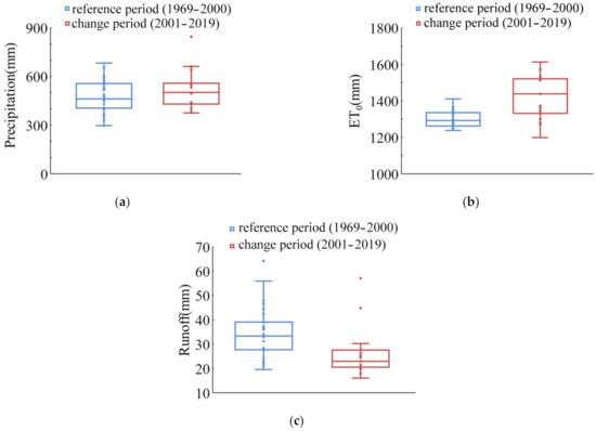 Characteristics of hydrological and meteorological elements during reference period and change period: (a) precipitation; (b) ET0; (c) runoff.