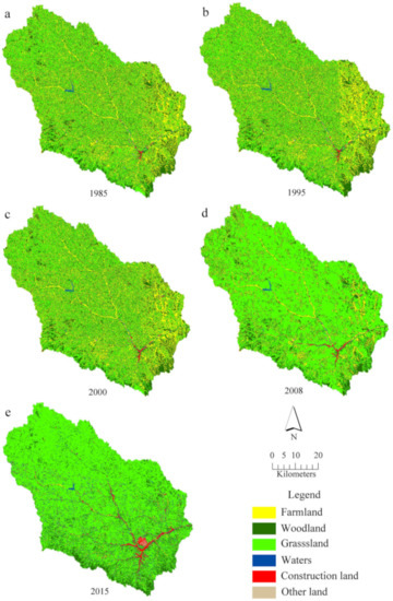 According to the interpretation results (Figure 5) of remote sensing images in 1985, 1995, 2008, 2010, and 2015, the area proportions of each land-use type in the Yanhe River basin were calculated. The area of farmland, woodland, and grassland accounted for 99.29%, 99.22%, 99.16%, 99.05%, and 95.91%, respectively, of the total area in the years above.