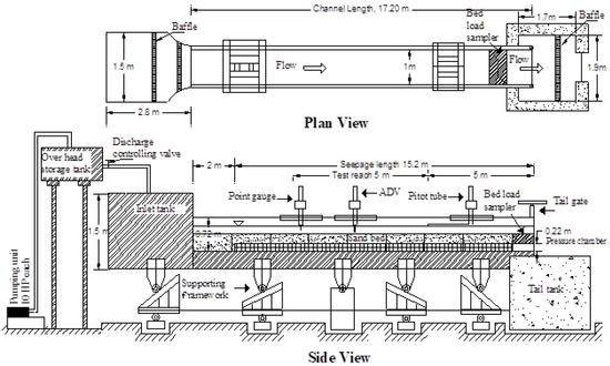 Experiments were conducted in a 17.2 m long, 1.00 m wide, and 0.72 m deep glass-walled rectangular flume in the Water Resources Engineering Laboratory at the Indian Institute of Technology, Guwahati, India. The bed slope of the flume was kept constant for the no-seepage and seepage runs with a value of 0.0005 (Figure 1). A couple of baffle walls were fixed at the inlet of the flume to decrease the degree of flow turbulence when the water entered the channel. The bed was levelled with glass with a smooth finish, and was made with a non-uniform sediment with a median grain size of d50 = 0.5 mm and geometric standard deviation of σg (d84.1 − d15.9)/d50 = 1.65 to achieve a rough bed surface. It should be noted that d84.1, d15.9, and d50 represented the size of the particles for which the percentage of finer particles were 84.1, 15.9, and 50, respectively. Water was recirculated between the underground trench and the channel by using two centrifugal pumps. The tailgate was adjusted for the required flow depth in the channel. A valve positioned at the upper section of the inlet tank allowed for the preselected flow discharge. Further experimental details are available in Sharma and Kumar [14]. The channel bed was prepared with a non-porous section 2 m from the upstream end of the channel, and the remaining length (15.2 m) was prepared with a porous section by covering it in a fine mesh (0.1 mm). The fine mesh was sustained by the steel tube arrangement that was 0.22 m high, which was positioned on the bottom of the flume. The experimental setup for downward seepage was prepared by creating a seepage chamber 15.20 m long, 1.0 m wide, and 0.22 m deep. The seepage chamber was located beneath the flume bed to collect the loss of water from the downward seepage. The non-uniform sediment mixture was placed on a fine mesh that was 0.1 mm squared to ensure the free flow conditions from the entry to the seepage zone. The quantity of the seepage discharge was controlled with a pair of valves fixed to the seepage chamber at the outlet end of the flume by forming a pressure difference between the seepage chamber and the channel. The seepage was approximately uniform (slightly non-uniform), and was applied throughout the seepage zone length in order to maintain a constant seepage discharge in the main channel along the streamwise direction. Two electromagnetic flowmeters (EFMs), with an accuracy of ± 0.5%, were attached to the seepage chamber (pressure chamber) through pipes, which were utilized to measure the desired quantity of the seepage discharge [14]. The uncertainty associated with the experimental data was calculated before performing the experiments. The uncertainty regarding the measurements of the seepage discharge from the electromagnetic flowmeter was analyzed using various repeated tests. The standard uncertainty for the seepage discharge was approximately 3.75%, which suggests a satisfactory accuracy of the EFM used for the discharge measurement. Regarding the coordinate system of the channel, the streamwise velocity component was along the x-axis, the lateral velocity component was along the y-axis, and the vertical velocity component was along the z-axis, which was in a positive direction, upward from the bed surface. The flow depth was measured with a digital point gauge attached to a Vernier scale.