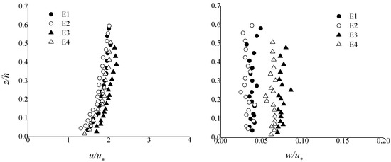 Figure 2 shows the streamwise and vertical velocities against the normalized flow depth (z/h) in the developing and the developed flow regions, where z is the distance from the bed of the measurement point. Velocity distributions, displayed in Figure 2, showed that the position of maximum velocity in the streamwise direction shifted upward, indicating the growth in the boundary layer thickness along the developing region [20,21]. The data of the experimental runs E1 and E2 did not overlap, but the velocity distributions were distinct for the developing and developed flows. In the case of the no-seepage runs (i.e., runs E1 and E2), the mean velocity of the streamwise and vertical directions for the developing flow fulfilled its maximum value in the vicinity of the water surface and slowly decreased towards the channel boundary because of the flow resistance due to the bed roughness. In the condition of the developing flows, the velocity values in the streamwise and vertical directions were amplified in comparison to the developed flow. The flow depth was slightly lower in the developing zone, and gradually increased along the channel length until the fully-developed flow condition was achieved. As a consequence, the streamwise and vertical flow velocities were higher in the developing flow. Measurements revealed that the streamwise velocities close to the channel boundary increased by approximately 7–9% in the developing flow, and the vertical velocities increased by approximately 10–12%. The streamwise and vertical velocity profiles for developing turbulent boundary layers are in line with the available literature [10,21]. In the seepage experiments, velocity measurements through ADV were taken immediately after the application of seepage to understand the effects of downward seepage on the flow characteristics of the channel. Flow velocities in both the developing and developed flows were higher than in the no-seepage conditions. Similar to the no-seepage conditions, in the developing flow, the streamwise velocities close to the channel bed increased by approximately 6–8%, and the vertical velocities increased by approximately 9–12%, in comparison to the developed flow. The velocity defect in the outer zone was more in the developing flow condition, as compared to the developed flows. It was observed that seepage flow influenced the vertical velocities (w) more than those of the streamwise velocities (u). The observed data nearly overlapped for the streamwise velocity, whereas the experimental data were far apart in the case of the vertical velocity, indicating a higher level of turbulence with seepage. The existing literature in the application of downward seepage shows that the distribution of the velocity tends to move vertically downward and, therefore, a greater velocity is observed close to the channel boundary [22].