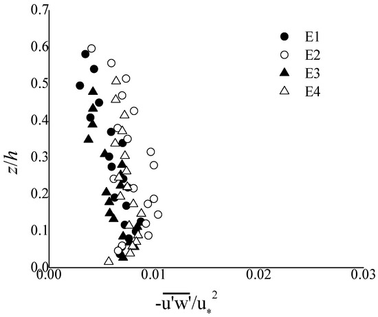 Depth profile of the Reynolds shear stress for runs E1 (developing flow and no-seepage), E2 (fully-developed flow and no-seepage), E3 (developing flow and downward seepage), and E4 (fully-developed flow and downward seepage).