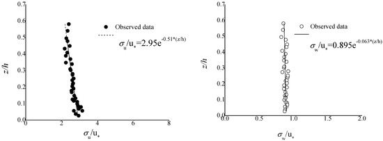 The turbulence intensity is an outcome of the variation in the instantaneous velocity at a measurement point determined by the velocity measurement and the type of bed roughness. Additionally, the root mean square (rms) of the fluctuating component of the velocity indicates the turbulence intensities. Hence, the streamwise and vertical turbulence intensities represented by σu, and σw, respectively, are given by