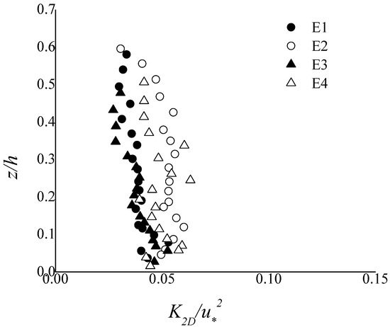 In the present paper, u, v, and w represent the mean streamwise, lateral, and vertical velocity components, respectively, while u′, v′, and w′ are the fluctuating components of the velocities, respectively. Similarly, , and are the turbulence intensities. Moreover, u∗ [=] represents the shear velocity where τ0 = the boundary shear stress observed from the distribution of the Reynolds shear stresses (τuw) projected to the bed surface, which is as given by Nezu and Nakagawa [20]. The shear velocity for the experimental datasets E1, E2, E3, and E4 were 14.41 mm/s, 14.57 mm/s, 14.65 mm/s, and 15.02 mm/s, respectively. In the near-bed zone, the uncertainty errors for the velocities and the Reynolds shear stresses were lower than 5% and 12.5%, respectively, indicating ADV data accuracy. Moreover, based on the flow field classification suggested by Nezu and Nakagawa [20], the present study distinguished the flow field into four layers: (i) the inner layer (z/h < 0.2); (ii) the outer layer (z/h ≥ 0.2); (iii) the intermediate layer (0.2 ≤ z/h ≤ 0.6), and (iv) the free surface layer (0.6 < z/h ≤ 1). This categorization of the flow field was used to examine the key profiles of the fluid features.