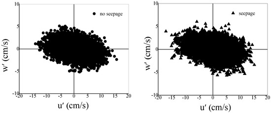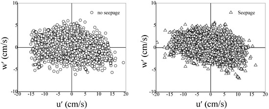 Figure 9 shows the scatter variations in the streamwise u′ and vertical w′ fluctuating velocities for hole size H = 0 in the inner regions of the developed flow, in the cases of the no-seepage and downward seepage experiments. The hole size H = 0 indicated that all u′ and w′ velocities were considered at the measurement point (z = 0.05h). Figure 9 shows that the sweep and ejection events mainly characterized the bursting events in the inner regions for the no-seepage and downward seepage conditions, while the contribution of the outward and inward interactions was somewhat weak, as compared to the sweeps and ejections through the entire flow depth. The comparison of the scatter variation of streamwise u′ and vertical w′ showed that the degree of the bursting events was higher in second and fourth quadrants (ejection and sweep). In the no-seepage and downward seepage conditions, the plot area of the velocity fluctuations in the inner region was nearly eclipsed, which showed that the turbulence was highly anisotropic. The degree of turbulence fluctuations without normalization increased with seepage, as can be seen in Figure 9. The input of bursting events to the production of Reynolds stress, as a measurement point, can be expressed as [20]