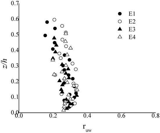 Figure 10 presents the depth profiles of the correlation coefficient ruw = (at different water heights) for the developing and fully-developed flows with no-seepage and downward seepage conditions. It was observed that the correlation coefficient for the fully-developed flow was typically higher than that of the developing flow throughout the flow depth. The change in the correlation coefficient for the fully-developed flow was due to the relative modification of the Reynolds shear stress over the turbulence intensity. Figure 10 also reveals that the correlation coefficient reduces, although very gradually, in the vicinity of the bed surface for both the developing and fully-developed flows. Interestingly, this observation matches the findings of Kironoto and Graf [31] for hydraulically rough wide-channels. The effect of seepage on the correlation coefficient was noticeable, as the correlation coefficient near the bed for the seepage runs was generally lower, by 5–10%, than in the case of the no-seepage condition. The observed correlation coefficient changes over the seepage bed were due to the comparative alteration of the Reynolds shear stresses over the turbulence intensities.