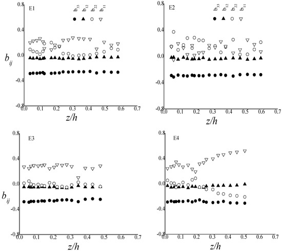 Reynolds stress anisotropy tensor (b33, b12, b22 and b11) for runs E1 (developing flow and no-seepage), E2 (fully-developed flow and no-seepage), E3 (developing flow and downward seepage), and E4 (fully-developed flow and downward seepage).