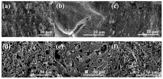 SEM microphotographs of (a) MAlg-Fe, (b) MAlg-Cu, (c) MAlg-Fe-Cu, (d) CMAlg-Fe, (e) CMAlg-Cu, and (f) CMAlg-Fe-Cu aerogels.