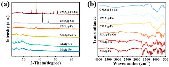 (a) XRD spectra of MAlgs and CMAlgs aerogels, (b) FTIR spectra of MAlgs and CMAlgs aerogels.