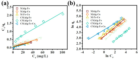 The adsorption processes of MAlgs and CMAlgs aerogels were fitted with Langmuir and Freundlich models, respectively. Both the Langmuir and Freundlich models can fit the experimental data well, and the Freundlich model has a better fit (R2 > 0.99).