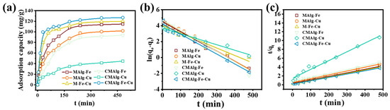 A kinetic model was used to fit the data to understand the reaction pathway and the adsorption rate of the aerogels. The adsorption of tetracycline by MAlgs and CMAlgs aerogels increased sharply during the first 30 min of the adsorption process, and then the adsorption process slowed down until it leveled off (Figure 6). At the beginning of the reaction, tetracycline molecules rapidly occupied the abundant active sites on the aerogel surface, and the adsorption amount decreased with time due to the saturation of the active sites as the reaction proceeded. The fitted parameters of the kinetics of tetracycline adsorption by MAlgs and CMAlgs aerogels are shown in Table 2. Both the fitted primary kinetic model and the fitted secondary kinetic model can fit the experimental data well, in which the fitted secondary kinetic model fits better (R2 > 0.99). Meanwhile, the amount of tetracycline adsorption by aerogels obtained from the fitted secondary kinetic equation is closer to the actual adsorption amount. Among the adsorption processes that control the adsorption rate are chemisorption processes accompanied by physical adsorption. Studies have shown that the faster adsorption rate of CMAlg-Fe-Cu aerogel is due to its ability to provide more mesopore volumes and more adsorption sites.