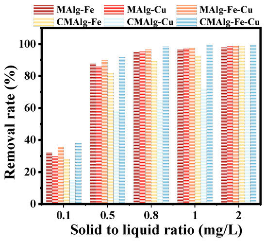 The effect of solid-liquid ratio on the removal of tetracycline by MAlgs and CMAlgs aerogels is shown in Figure 7. The solid-liquid ratio was set to increase from 0.1 g·L−1 to 2 g·L−1. The removal efficiency of MAlg-Fe-Cu and CMAlg-Fe-Cu aerogels had reached ~90% when the addition amount was 0.5 g·L−1, and then gradually increased and leveled off. However, the adsorption capacity of the MAlg-Fe-Cu and CMAlg-Fe-Cu aerogels showed a decreasing trend. It is attributed to the fact that tetracycline molecules quickly occupied the adsorption site at the MAlg-Fe-Cu and CMAlg-Fe-Cu aerogels surface. Then the adsorption site was gradually saturated, and the system tended to be in equilibrium. The higher removal efficiency is caused by the increase of total surface functional groups and effective contact area. Excessive addition of aerogel leads to the decrease of adsorption capacity because the overlap of active sites reduces the effective contact area of tetracycline and causes waste of adsorbent. 0.8 g·L−1 was selected as the most suitable solid-liquid ratio in consideration of removal efficiency and economy.